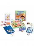 В комплекте: 45 картонных продуктов питания (с ценой на обороте), 40 картонных монет, 2 деревянные панели и 1 деревянное основание для создания прилавка, картонный калькулятор, 8 списков покупок, фетровый кошелек с магнитной застежкой.