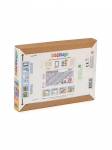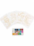 В наборе: 16 баночек песка разного цвета, 4 толстых картинки с клейким слоем под пленкой (18 х 25 см), рамка (19 х 26 см), маленький ножик для отсоединения клейкого слоя, инструкция.