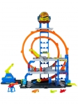 Этот многоуровневый комплекс открывает безграничные возможности для игр. Юный гонщик сможет запускать машинку в двойную петлю, направляя ее на нужный этаж при помощи специального механизма, а затем мыть на первом уровне в настоящей автомойке с подвижным роликом и моющей занавеской. На втором и третьем ярусах — детализированная зона техобслуживания с подъемником, заправочными пистолетами, ремонтным роботом и воротами. Главное преимущество мега-гарaжа — парковка на 36 машин масштаба 1:64, что обеспечивает удобное хранение и эффектную демонстрацию коллекции. В набор уже входят автомобиль и вертолет с крюком для транспортировки.