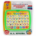 Планшет имеет две активные стороны для изучения русского и английского алфавита. Всего ребенок сможет услышать 300+ слогов, слов и звуков на русском и английском, 150+ вопросов, загадок и стихов, песни про русский и английский алфавиты. Есть режим экзамена.