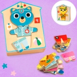 Первый пазл Одежда — интересная развивающая игра в виде легкого пазла для самых маленьких. Игра представлена в виде деревянной коробочки, в которой хранятся детали пазла, крышка выполнена в виде домика с выемкой. Ребёнку необходимо собрать из трех деревянных деталей забавных котиков в разной одежде: кошечку-балерину, котика-доктора, котика-пирата и котика-индейца. Малыш сможет узнать, как выглядят разные костюмы.