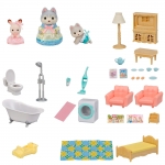 В комплекте: главный блок дома, комната у дымохода, аксессуары (большая и малая крыша, лестница, крыша над подъездом, 3 больших оконных рамы, 2 маленьких оконных рамы, 3 маленьких забора, 5 больших заборов, 2 больших лампы, 1 маленькая лампа), почтовый ящик и письмо, счеты, детский игровой столик, а также подарочный набор (фигурки сестрица хаски, малыш хаски в ползающей позе, малышка шоколадный кролик в позе сидя, односпальная кровать, одеяло, торшер, туалет, душ, ванна, полотенце, пылесос, стиральная машина, столик, 2 кресла, телевизор с подставкой и двумя "каналами", 2 журнала, подставка для прессы, машинка, чайник, чайный набор на 2 персоны с печеньем).