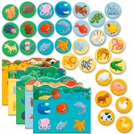 В комплекте: 5 игровых базовых карточек с темами (обитатели леса, джунглей, подводного мира, фермы и домашние питомцы); 30 круглых игровых фишек с разными персонажами; подробная инструкция.