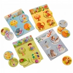 В комплекте: 4 игровых базовых карточки с темами: зима, весна, лето, осень; 16 круглых игровых фишек с разными персонажами и сюжетами, подробная инструкция.