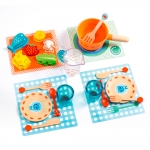 Ваш ребенок может выступить организатором званого обеда для двух котят. В комплект входят кастрюля с лопаткой, тарелочки, кувшин, стаканы и столовые приборы с изображением котят. Набор дополняют реалистичные фигурки еды — клубники, салат, дольки лимона, кусочки сыра, шампиньоны и рыбка.