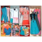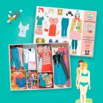 В наборе: 3 бумажные куколки высотой 23 см; 8 жакетов; 21 брюки; 8 блузок; 7 джемперов; 29 пар обуви и аксессуаров.