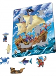 Головоломка иллюстрирует сцену, где бравые пираты с добычей направляются к острову, тайно преследуемые еще одними претендентами на сокровища. Рамка поможет начать сборку пазла.