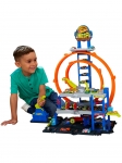 Этот многоуровневый комплекс открывает безграничные возможности для игр. Юный гонщик сможет запускать машинку в двойную петлю, направляя ее на нужный этаж при помощи специального механизма, а затем мыть на первом уровне в настоящей автомойке с подвижным роликом и моющей занавеской. На втором и третьем ярусах — детализированная зона техобслуживания с подъемником, заправочными пистолетами, ремонтным роботом и воротами. Главное преимущество мега-гарaжа — парковка на 36 машин масштаба 1:64, что обеспечивает удобное хранение и эффектную демонстрацию коллекции. В набор уже входят автомобиль и вертолет с крюком для транспортировки.